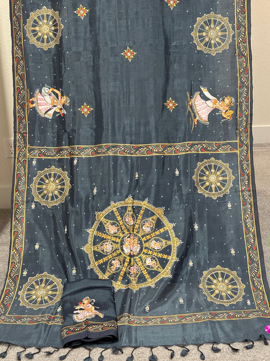 Grey Mangalgiri Pattu Pattachitra Saree with Konark wheel