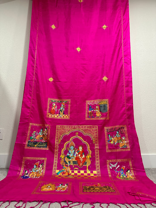 Pink Pure Silk Pattachitra Saree with Ramayana theme.