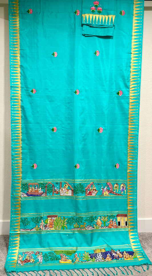 Sea Green Pure Silk Pattachitra Saree with Ramayana theme.