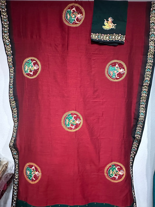 Ganjam Bomkai on Brick red Tussar with double black temple border