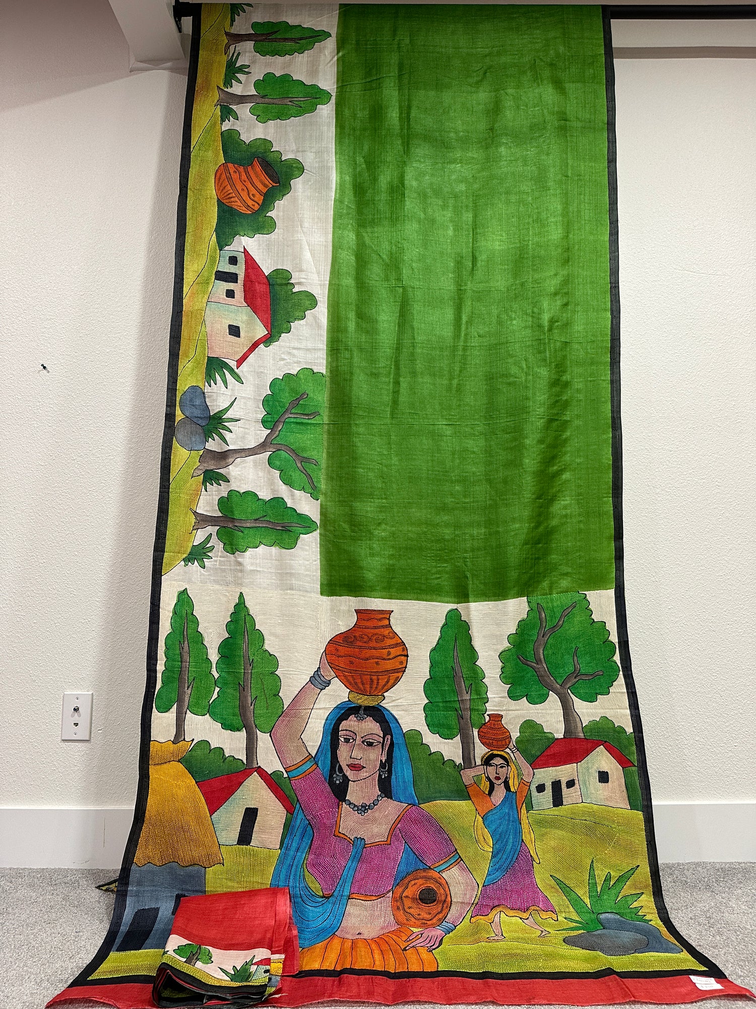 Sea Green Pure Silk Pattachitra Saree with Ramayana theme.