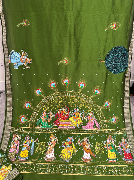 Olive Green Soft Silk Pattachitra Saree with Dancers and trees