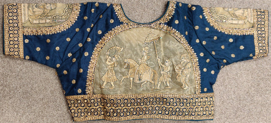 Blue Pure Silk Pattachitra Saree with Ramayana theme.