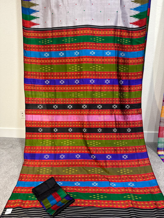 Berhampuri double palla in Grey with multicoloured temple border and multicoloured aanchal