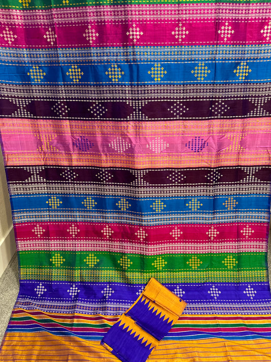 Berhampuri double palla in Royal Blue with mustard Yellow temple border with multi coloured aanchal
