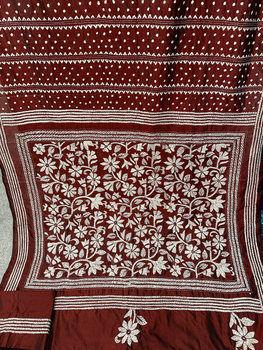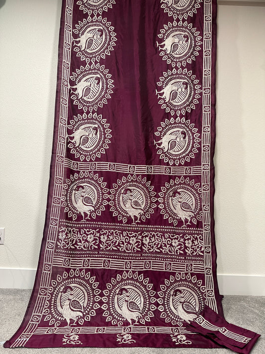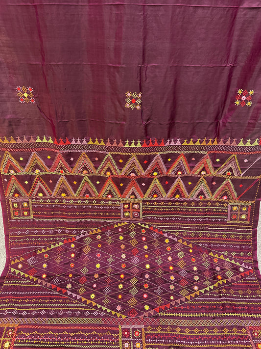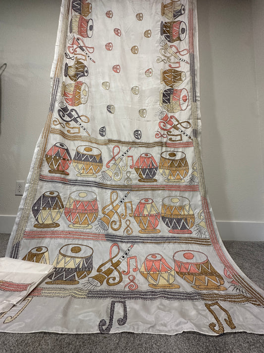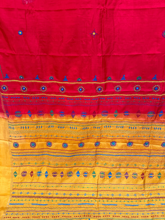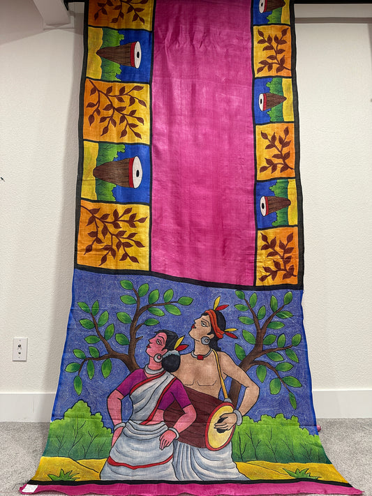Kaantha Stitch on Dyed and Hand painted Tussar Saree - Tribal Dance Scene