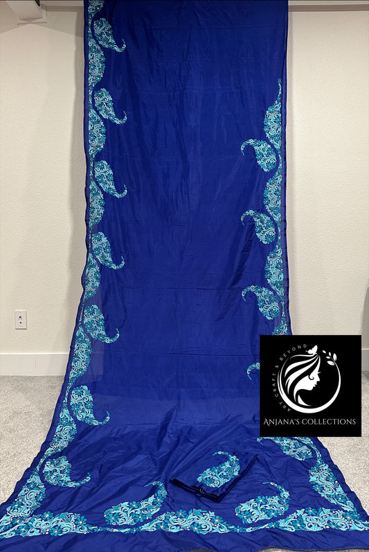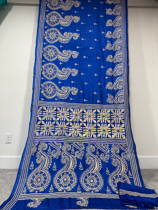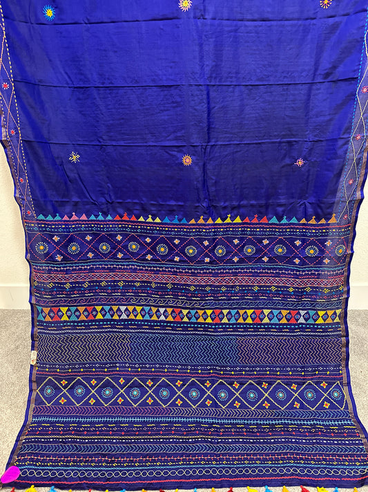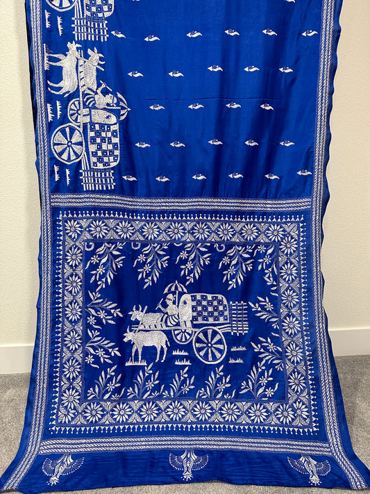 Kaantha Stitch Saree - Royal Blue with cow cart design.