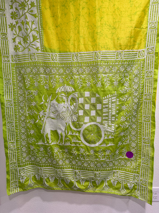 Baatik Kaantha - Lime Yellow body with Cowcart design on Anchal
