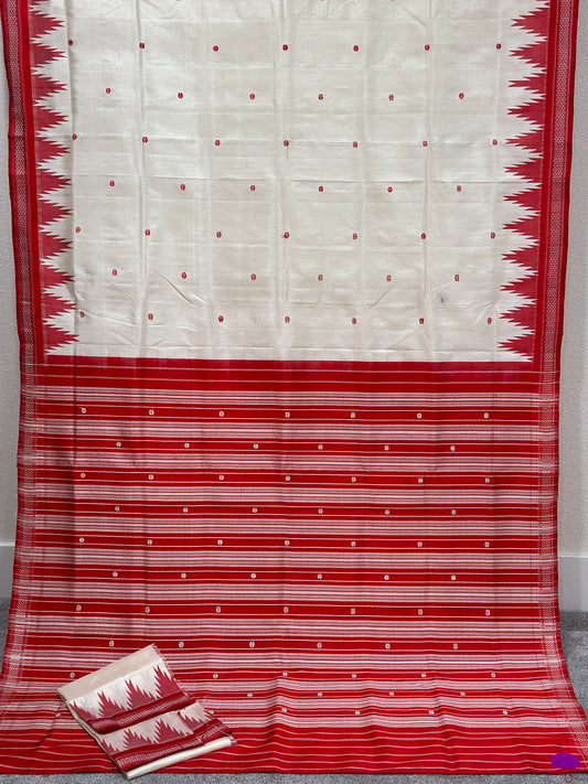 Berhampuri Single palla white with red temple border and red and white striped aanchal