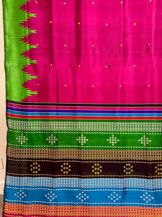 Berhampuri DoublePalla in Magenta green and yellow temple border with multicoloured aanchal