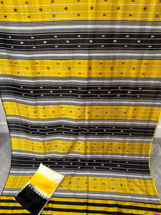 Berhampuri double palla white with yellow and black temple border with black and mustard aanchal